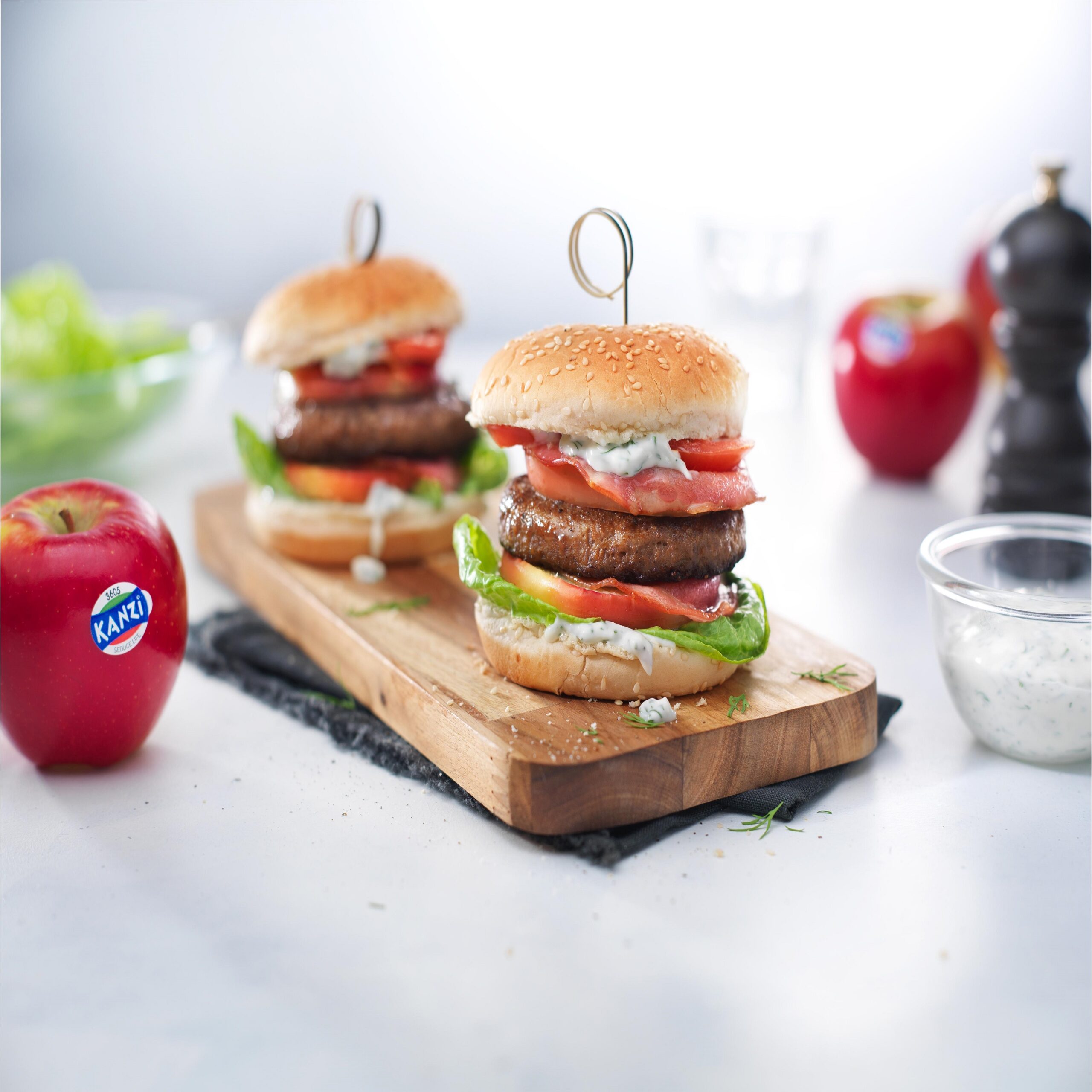 7 Uzklājiet diļļu majonēzi uz maizītēm un pēc kārtas uzlieciet romiešu salātu lapas, ābola šķēli ar bekonu, liellopa gaļas burgeru, vēl vienu ābola šķēli ar bekonu un tomāta šķēles. Uzlieciet